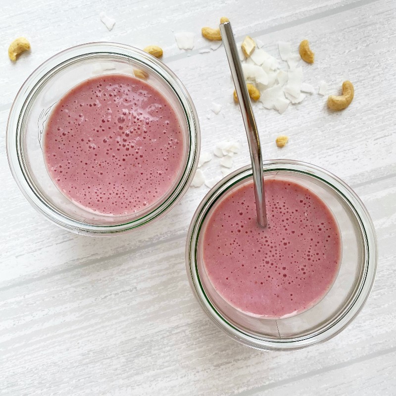 Hindbærsmoothie med blomkål, kokos, cashewnødder og vegansk vaniljeyoghurt – en cremet, mættende, frisk og børnevenlig smoothie. Den smager skønt af syrlige hindbær, har et lille hit af kokos og er fyldt med gode og sunde kostfiber og fedtsyrer fra blomkål og nødder. – og bare rolig, den smager overhovedet ikke af kål. Jeg elsker at blende blomkålsris i mine smoothies, da de kan gøres helt smagsneutrale, og det er derfor en genial måde at få sneget lidt flere grøntsager ind i de mindste på. I denne lækre kombination gemmes blomkålssmagen af hindbær og kokos.